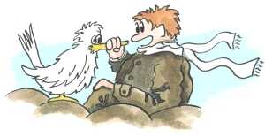 " Did you say something." said Albi. " And it's talking'" said the creature. Albi started to flap his wings. " Wait can't we talk." said the creature. " I'm not talking to any one who can pull his hands off and his eyes out." said Albi. " They are only mittens and goggles." said the creature. " I've got a hat as well. " said the creature pulling the top of his shinny head off. A mop of reddish heir flopped out. " Hay you're a sailor." said Albi " I'm not a sailor said the man looking at the Albatross. " I'm a pilot." " You can't fool me." said Albi. " You are in a boat bobbing up and down on the sea, so you are a sailor. Pilots fly aeroplanes up in the sky." " Not if the wings fall off they don't." said the pilot. "When that happens aeroplanes tend to want to try and be submarines." |