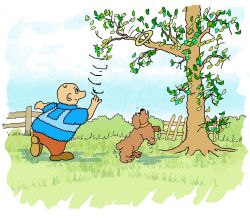 Podd all excited at chasing the ring, ran after the ring and without thinking climbed up the tree to the branch where the donut shaped ring was lodged.