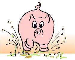 Hearing the splash of water Percy the Pig remembered he was thirsty and came running toward the water trough.