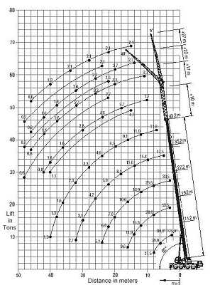The lifting capacity of the Hydra 300 was 30 tons, this is the maximum lift which can be made and is with the shortest reach. What was usually more important was the maximum reach. Charts and tables show how much the cane can lift at any particular reach, as the example below. |
