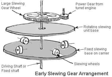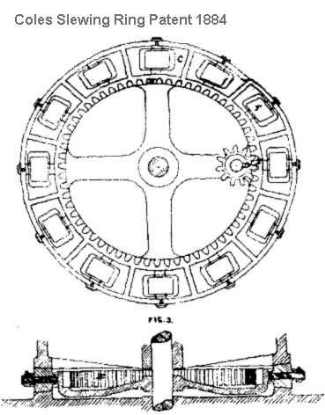 Although the above system continued to be used Coles in 1884 had patented a slew ring that combined the large gear wheel and rotating wheel platform into one unit. This is the layout that was to develop in the type used today.