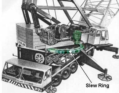 The slew ring is the component of a crane that allows the upper part of a crane to caring the jib to rotate allowing a wide movement of the carrying hook.