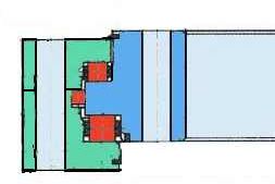 As bearings developed the advantage of the roller bearing were realised and the thrust bearing was developed. Here as seen in these cross sections the rotating rollers (red) are fixed between bolted flanges (green) so that they are above, below and at the side of the rotating slewing ring (blue). This takes the thrust of the load in all directions, upward, downward and to the side.