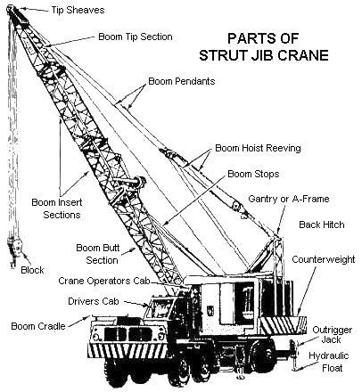 Simple diagrams showing the names of most parts and items on the standard mobile crane unit