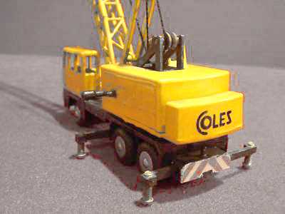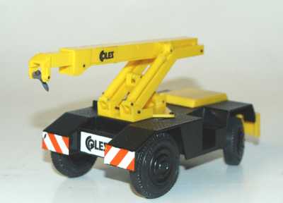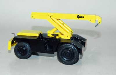 Coles Power Crane Made by Schuco between 1964 and 1976 this Rare and complete model shows that Coles were internationality known. This model, which is more a model than a toy has 14 separate pieces, a four piece boom, supported and moved by 6 pieces of connecting rod, can lift one of three silver weights. Two hand cranks move and side outriggers, with screw jacks, extend and contract in lorry base. Based on the Argus 30 ton unit with continental cab which had been introduced in 1959 Scale unknown |