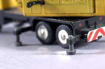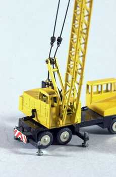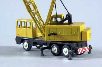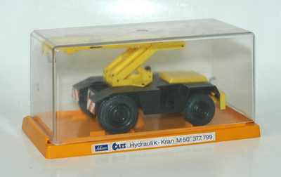 Schuco Model - special 5 Ton Mobile Carry Stacking Crane. This is a model of the M50 a hydraulic Mobile Carry Stacking crane made at the Duisburg factory in Germany. Designed in Sunderland around 1970 but built in Germany from about 1972, it was mainly for the European market. This model of the M50 has a length of about 5.5 inches, it could be 1/32 scale. The chassis is made of metal, the crane itself of plastic (it seems like the plastic used by the well known French manufacturer Bourbon for its Poclain crane models). The steering wheel works on the rear axle. The box of this model seems like their from the Schuco car models from the 70's, as well as the reference, 377.799. This is quite a sophisticated model for its size and is not referred to in any Schuco catalogues so it would seen that it a probably a promotional model made for Coles marketing. Single batch order around in 1972. (quantity unknown.) Scale 1:32 |