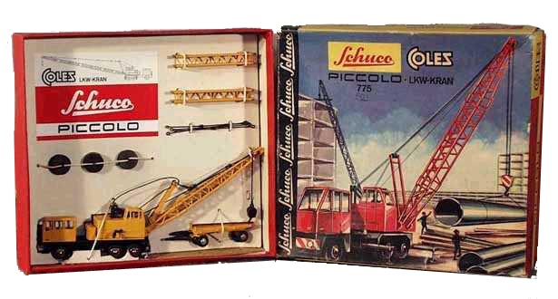 ![]() ![]() SCHUCO - Argus 30 ton ![]() Another toy maker producing high quality die-cast toys was German toy maker Schuco. They started producing toys in 1957. These were quality toys but in the 1960 commodity prices, especially Zinc which was the main "ingredient" for Piccolo's, started to rise by the end of the 1960's, Schuco had no choice but to discontinue the production. In 1969 the last Piccolo's left Nuremberg which the exception of the Coles crane which continued until the bankruptcy of Schuco in 1976. |