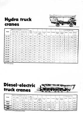 Hydra truck cranes model tons chaissis 10/12T 10 4x2 12/14T 12 4x4 13/17T 13.5 4x2 13/17T 13.5 4x4 16/18T 16 4x2 20/22T 20 6x4 25/28T 25 6X4 30/33T 30 8X4 30/35T 30 8X4 45/50T 45 8X4 54/60T 53 8X4 LH1000 98.4 14X8 Diesel electric cranes Zealous 55 8x4 L4000 140 10x8 Colossus 5000 226 12x10 Colossus 6000 250 14x8 |