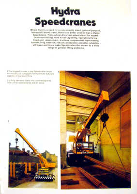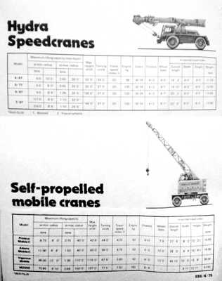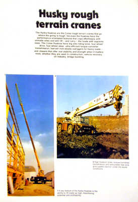 Husky Rough Terrain Cranes The Hydra Huskies are the Coles rough terrain cranes that go where the gong is tough because the Huskies have the performance orientated features that cope effortlessly with unmade sites and still lift - and carry - the loads with supreme ease. The Coles Huskies have big site riding tyres, four wheel drive, four wheel steer. ultra efficient torque converter transmission, fast set rock steady outriggers for heavy loads - and chassis that offer real stability and strength when it matters most, weather they are used in construction, vehicle recovery, oil industry or bridge building. Hydra Speedcranes Where there's a need for a conventionally sized, general purpose, telescopic boom crane there's no better answer than a Hydra Speedcrane. Front wheel-drive/rear-wheel-steer for superb manoeuvrability. road travail capability, exceptionally low headroom requirement, a unique compensated rope-reeving system, long outreach, robust construction and utter reliability all these and more make Speedcranes the answer to a wide range of general lifting problems. Self Propelled Mobile Cranes These are the work horses of the Coles range, in action round the clock all over the world in factories, depots, stores, timber yards, ports and terminals - anywhere that rugged and reliable lifting capability is required. Coles self propelled mobiles with a wide range of maximum lifting capacities, are available with strut and cantilever jibs and can be fitted with tongs, electro magnets, grabs and other specialist handling devices. |
