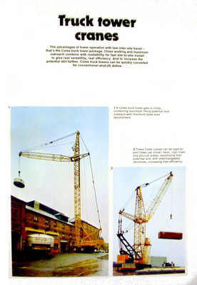 The remaining pages of this catalogue simply give publicity discriptions of the types:- Truck Tower Cranes The advantages of tower operation with fast inter-site travel that's the Coles truck package. Close working and maximum outreach combine with road ability for fast site-to-site transit to give real versatility, real efficiency. And to Increase the potential still further, Coles truck towers can be quickly converted for conventional strut duties. |