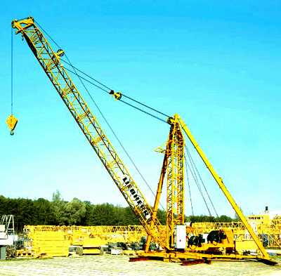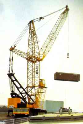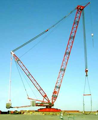 ![]() Crawler mounted crane for very heavy lifting on land. They combine the features of derrick and lattice boom mobiles. They use very large extended counter-weights, masts and often roller rings that move the booms fulcrum and the cranes tipping axis further away from the crnter of gravity. These cranes lift several hundreds of tons but are difficult to transport and setup. |