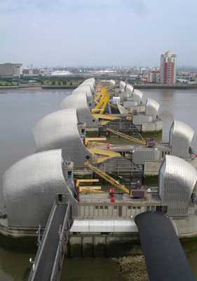 Thames Barrier The Thames Barrier is the world's second largest movable flood barrier and is located downstream of central London.Coles cranes were built into the seven piers holding the gates. |