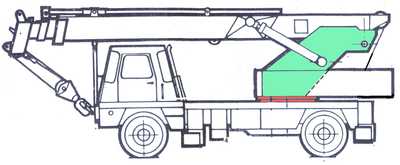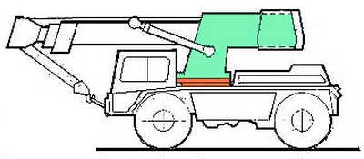 The design was solved by modifying the design used on the lorry unit a simple 'L' plate system. Two heavy steel inverted 'L' plates were made with the top leg of the 'L' sitting on the 'Slew Ring', the long leg of the L would rase the jib support above the cab of the unit. These plates provided space a larger boom, provide anchor points for the hydraulic rams, space for the rotary coupling, slew motor and counterweight. The high counterweight was possible because of the extra weight of the chassis, this configuration also allowed for a shorter wheel base.