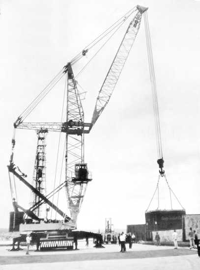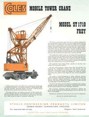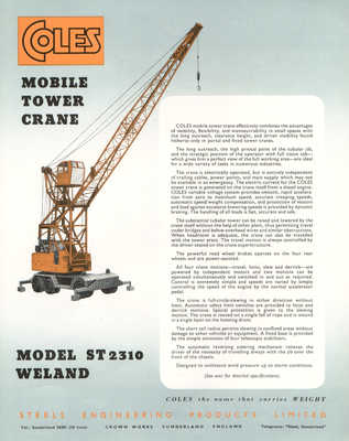TYPE DATABASE - Mobile Tower Cranes Coles never made what we now call tower cranes or fixed base cranes. What they did produce were mobile port cranes, semi tower high reach luffing cranes and container handling cranes. These were available in two different types; self propelled mobile cranes; and truck mounted mobile cranes. Self-propelled mobile cranes were designed for use where only a limited amount of travelling was required. Coles mobiles were available in two models. They are each available on two models. They are each capable of lifting containers on and of trucks: travelling with loaded containers suspended from the hook; stacking containers; and discharging loaded containers from up to 10m (33ft) outreach. The cranes could also be used for the discharge of general cargo of up to 40m (130ft) radius and for handling heavy cargo up to 40 tons (Vigorous Mobile) or 90 tonnes (M2000 Mobile). Truck mounted mobile cranes are, as their name implies mounted on chassis designed to travel at fast highway speeds when required. The mass introduction of container shipping in the late 1960s lead to Developing the 1000 series to accomodate the heaver lifting required. Coles 1000 series trucks were available in four models, capable of discharging loaded containers from vessels of over 30m (98ft) beam, according to model. In addition, they can handle heavy cargo of unit loads up to 100 tonnes (Coles Colossus 2000 HLT). 150 tonnes (Coles Colossus 4000 HLT), 240 tonnes (Coles Colossus 5000 HLT) or 260 tonnes (Coles Colossus 6000 HLT). General cargo can be also discharged at up to 50m (165ft) radius. CLICK on any IMAGE of these to go to a page dealing with that type of unit. This will have photographs and any details available. |
