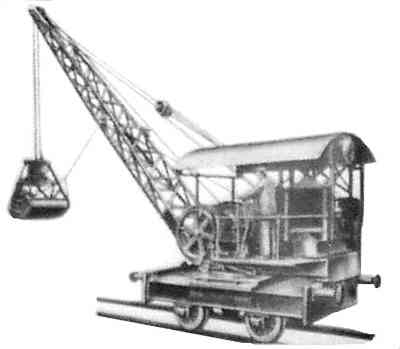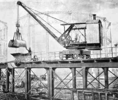 ![]() When the Coles Brothers took over the foundry and works at Summner street in London they carried on its existing trade of making steam powered rail cranes. They were however quite inventive and one of their early patents was a single cable loading grab which helped sell there cranes. An early engraving from one of the early catalogues shows this type of crane working on coal stacks at a gas works. |