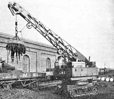 ![]() Petrol electric crawler with electro magnet. Coles had tried petrol electric with the Tilling, and the Ransoms cranes were petrol electric, for none rail mobile crane is was a much more flexible system. The tracks were probably bought in and electrically powered. I this case tracks were probably wanted as it was running over scrap metal in the yard. The move over to the cantilever jib must be noted, here taking a leaf from the Ransome model the high level jib meant the crane could get closer to the working area and over the sides of rail wagons. |
