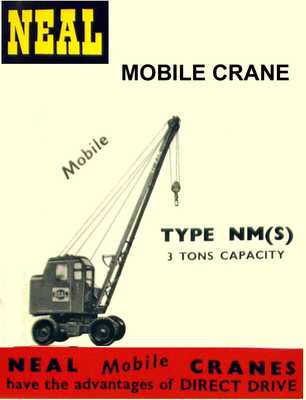 Notes - Typical rating on 25'0" jib - 3 ton at 10'6" - height of lift 22'0" - jibs upto 45'0" Patent Safety Hoist, differential drive. Two speed travelling in either direction. Direct drive system Image 1. - All Neal Mobile Cranes from 2 tons capacity could be supplied as lorry mounted this NM(S) is a typical example. Click on any picture for bigger image |