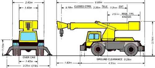 Notes - Three section boom. This crane was a stretched version of the Mark 4 it was a metre longer giving it a longer boom and better reach. Outriggers give the extra stability for the longer reach while still keeping the seven ton lift. A full specification can be seen by clicking HERE : SPECIFICATION PAGE. Click on any picture for bigger image |