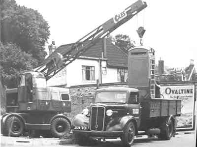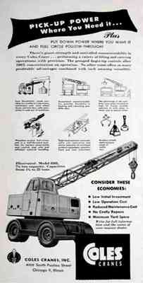 Notes - The prime-mover is a petrol engine developing 47 h.p. at 1800 r.p.m. which drives an alternator supplying power to electric motors. All four movements (hoisting, slewing, derricking and travelling) are independently electrically operated. All controls are operated from the cab and automatic overload prevention features are provided. The maximum loads which can be lifted are of the order of 3 tons but these and the outreach can be varied according to the type and length of jib fitted. The crane is fitted with steel lifting ropes and stabilizing jacks. Dimensions Length 13 ft. Width 7 ft. 6 in. Height 11 ft. 3 in. with jib horizontal. Weight 12 - 16 tons according to lifting capacity Travelling speed 6 m.p.h. (unladen) Click on any picture for bigger image |