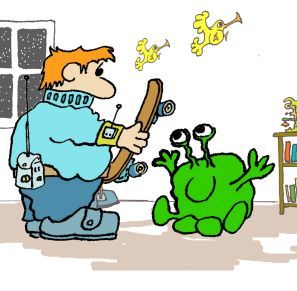 When Ogg came to Tony's crottage to deliver his next parcel of frozen electricity, Tony showed Ogg the brand new skateboard he had bought him. Ogg’s eyes nearly popped out of his head. In fact they did pop out of his head but that is the way Ogg’s eyes actually work. Ogg was delighted, he thought it the most wondrous thing in the world or perhaps that should be on the Moon. Ogg read the instructions that simply said you stand on it and push yourself along with one foot. Ogg knew he would soon get the hang of that if only he could work out which foot to use as he had four. |