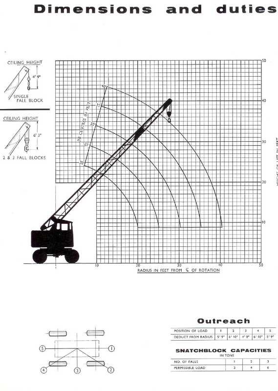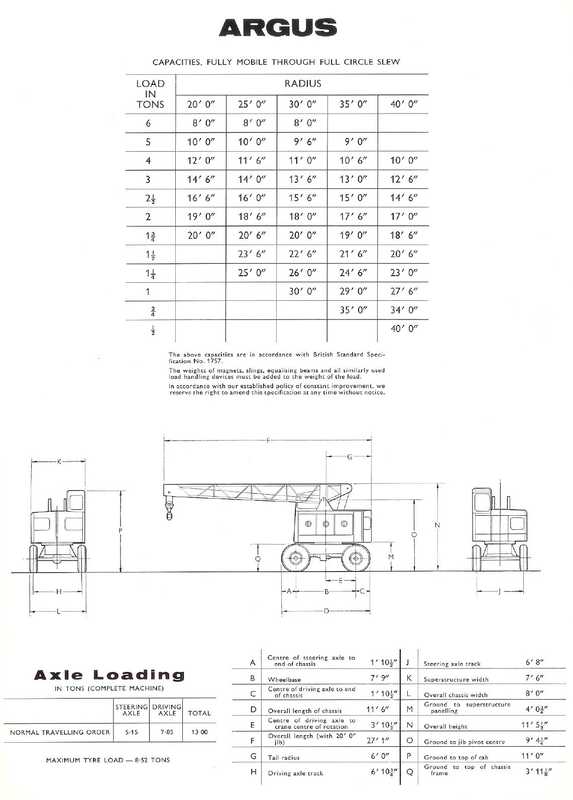 The crane power unit on the superstructure is a diesel engine directly coupled to a variable speed generator which energises the electric motors of the three crane motions (hoisting, derricking and slowing) and in addition the travel motor, by direct current at a potential varying from zero to maximum value. Each motion of the crane is controlled by an interlocked pair of heavy duty reversing contactors operated by pilot switches conveniently located in a console in the driver's cab. The normal driving routine is to engage the pilot switches for the motion or motions desired while the engine is running at reduced speed and thereafter to control the speed of the motion as desired by varying the engine speed through the accelerator. As the engine is accelerated the appropriate electro mechanical brakes are automatically released. In addition, Coles automatic control and automatic protection is incorporated to safeguard the machine against abuse. This permits the driver to select any motion, irrespective of the engine speed, whereupon the electrical equipment automatically operates to introduce the required motion without shock to the electrical or mechanical components of the crane. No restraint is placed upon the activities of the crane driver and this complete absence of restriction achieves the optimum operating cycle. The crane revolves on a large diameter double live ring of steel balls running in hardened races. This double race ball bearing obviates the need for a contra post and gives more even distribution of loading on the chassis frame. The chassis is a carrier specially designed for crane service. Power is transmitted through an electric travel motor and a single speed gearbox which is coupled by a propshaft to the driven axle. The driven axle is of the fully floating type with overhead worm and wheel reduction. Coles automatic reversible steering is fitted to give normal control with the jib over either end of the chassis. Two leading shoe hydraulic brakes are fitted to all wheels. The footbrake acts on all wheels through a mechanical-hydraulic vacuum assisted system and the parking brake operates independently through a mechanical system on the driving wheels only. CRANE DATA Engine - Perkins diesel, developing 49 h.p. at 1800 r.p.m. The engine speed is controlled by a foot throttle in the operator's cab. A fuel tank of 12 gallons capacity is fitted. The Motors and Generator - Have been specially designed as matched machines for our self-propelled crane duty which involves operations over a wide range of current, voltage and speed values and to give the performance figures tabulated under Operating Speeds. Generator - Variable voltage (0 to 400 volts), variable speed. Hoist motor - Variable voltage, maximum output 11 h.p. Derrick motor -Variable voltage, maximum output 11 h.p. Slew motor - Variable voltage, maximum output 2 h.p. Brakes - Electro mechanical, automatically applied brakes are fitted to hoist, derrick and slew motions, the shoes being spring applied and released by a continuously rated solenoid coil. Operator's Cab - Totally enclosed, full vision type with safety glass windows, adjustable seat, door equipped with lock. Limit Switches - Totally enclosed, automatically self resetting type are fitted to prevent over winding and over lowering on the hoist motion and over derricking beyond prescribed limits. Radius Indicator - Showing maximum loads at various radii. Jib - Cantilever type, lattice construction. Basic length 20'0". Electrical Equipment - 12 volt starting equipment is provided. An electric horn is fitted and all wiring is carried out in P.V.C. insulated cable. CHASSIS DATA Chassis Frame - Designed specially for crane service and is constructed from steel sections and plates. The frame is electrically arc welded. Travel Motor - Variable voltage, maximum output 15 h.p. Gearbox - Single speed 4/1 ratio. Driven Axle and Transmission - Fully floating type axle shafts and differential with a worm and wheel reduction of 13-5/1. Steering Axle - Is solidly mounted to the chassis frame. Wheels and Tyres - 12.00 x 20 pneumatics, singles all wheels, fitted on 8.37" flat base rims. Brakes - Two leading shoe hydraulic brakes, 15.25" dia x 4.25" are fitted to all wheels. Steering - Coles automatic reversing gear. Toolbox - With complete tool kit is provided. OPERATING SPEEDS HOISTING ON SINGLE LINE LOAD, TONS | 2 | 1 | LIGHT LINE SPEED, F.P.M. | 55 | 70 | 85 Derricking -Maximum to minimum radius in 20 seconds. Slewing - 2 r.p.m. laden. Travelling - Unladen, up to 4 m.p.h. on firm, level ground. Laden, up to 2 m.p.h. on firm, level ground. Turning Radius - 21'- 0" kerb radius. ---------------------------------------- Optional Equipment CRANE Single Hook - With pearweight for faster hoisting speeds with light loads. Safe Lend Indicator - Coles B & A automatic indicator gives audible and visual warning of overloads and cuts the hoist and derrick circuit automatically at a predetermined overload. Grabs and Magnets - Twin rope grabs. hook on self-dumping grabs or ring discharge single chain grabs up to 21/17 cu. ft. capacity. Electro magnets up to 40" dia. Tabling Spring-loaded drum for control of grabs. Spring Drum -For use with twin rope grabs. Electrical Equipment - 2 head lamps, 2 side, 2 tail, radius indicator, jib head, cab and inspection lamps. Jib - 30'-0" centres. Bolted Extensions 5'-0" and 10'- 0". Tropical Cab - With fan and opening windows. Arctic Cab - With heater and fibreglass insulation. Windscreen Wiper - Electric heavy duty type. Telescopic Jib - Manually or power operated. CHASSIS Steering - Air pressure, power assisted. Special Transmission - Larger travel motor and generator for increased tractive effort. STEELS ENGINEERING PRODUCTS LIMITED C R O W N W O R K S. SUNDERLAND, ENGLAND · Tel: 56281 (10 lines) Grams: Steel, Sunderland | ||||