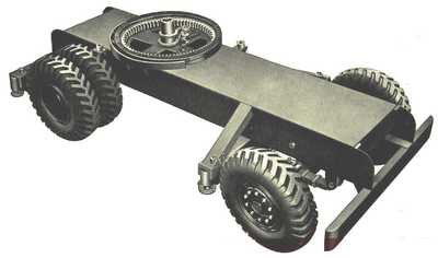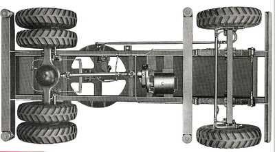 fully floating axle shafts and differential with spur and spiral bevel reduction. Conventional laminated springs are used for the front axle. The slew ring was centred to make the weight distribution even on all tires situating its centre closer to the double none steering wheels at the rear.