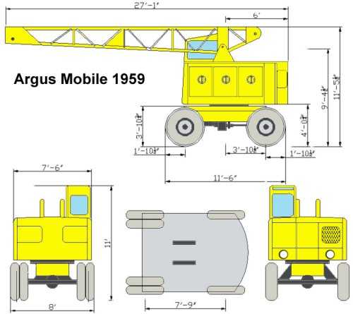 The Argus Mobile Crane is typical of a whole generation of Coles cranes. It was a development of the EMA mobile cranes which was so successful for Coles. The all electrical system made the workings simple robust and easily maintained. With its variable voltage system a small engine could be used and the driver had very fine control over all movements without excessive movement about the cab. This layout and system was so successful it was to be used for almost all their cranes until the introduction of hydraulics in the early nineteen seventies. For the full specification and load and reach tables of this machine - SELECT HERE Click on any picture for bigger image |