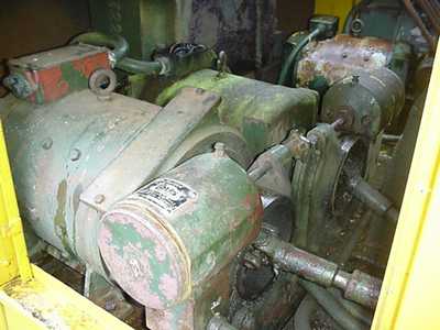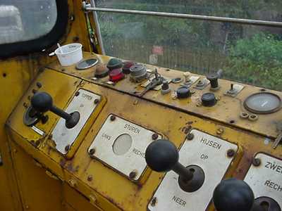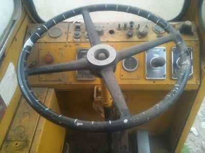 The basic layout of the power units are shown on the layout above 8. Shown Yellow is the Power Unit with a petrol or diesel engine coupled to an electrical generator. This can be seen through the side of the cranes in photo 9 above. The Slew motion is shown in Blue an electrical motor coupled to a gearbox driving a gear below the slew plate and engaging into the inside flange of the Slew Ring fixed to the chassis below. The Deric motion rising the jib shown green is a motor driving a small winding drum. The Hoist Cable shown Red is a similar but larger drum. The slew, hoist and jib motors can be seen in image 10 below. All the motions are controlled by three simple lever handles on the dashboard in front of the driver photo 11 below. Access to all the driving gear can be made through removable panels on the sides of the housing unit. 10.