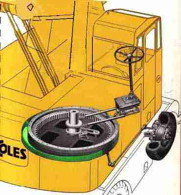The Coles self-propelled crane chassis was driven by a powerful electric motor on either the rear only or all four wheels. This motor was powered by the generator on the crane superstructure, power being taken down through the centre of the rotation axes pin. | ||||