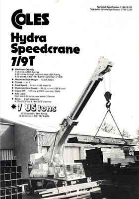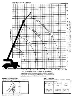 OPTIONAL EQUIPMENT Passenger seat. Cab heater. Tropical Cab. Lighting equipment, including flashing direction indicators. Engine hour meter Chassis Spotlight. Power operated tyre pump. Boom extension section 11' 0" (3,35m) centers, carried inside telescopic boom (power repositioning). Special painting. Towing hook front and rear. Visual and audible safe load indicator. 10' 0" (3.05m) fly jib. Torque Converter, Magnet equipment. Single hook and pearweight. Searcher hook. Drive axle 18.5:1 ratio giving maximum speed 19 miles/h (30 km/h) - creep speed 1 mile/h (1.60 km/h). Perkins 6/354 diesel engine. Wylie Pendulum type radius indicator. |