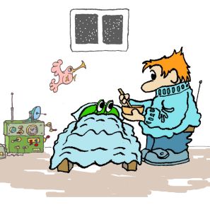 With a note from the doctor Tony took Ogg home and tucked him up in the spare bed. Dr Strange had said that Ogg would have to lie very still for at least two days. You see Bloggs have very short legs for a good reason, being very jelly like and very wobbly, they are not the kind of beings that can travel very fast. If they move too quickly their insides get mixed up, they get dizzy and sick and if they don't slow down their body stops working altogether. Luckily Ogg had not been moving about very very fast or it could have been a very serious illness. |